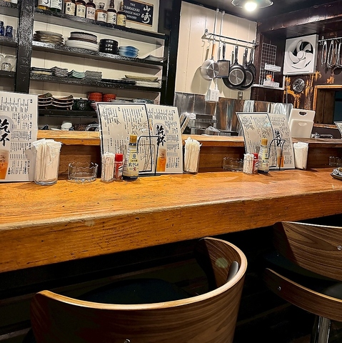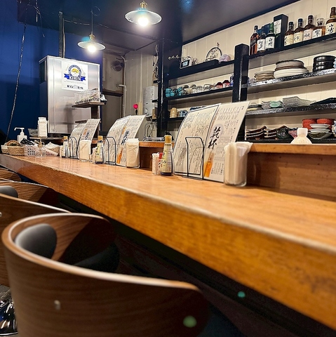 温かみのあるウッド調のカウンターが落ち着いた雰囲気を醸し出す、大人のための隠れ家のような居酒屋です。お一人様や少人数でのご利用に最適で、目の前で調理を見ながらゆったりとお酒や食事を楽しめます。店主との会話も弾むアットホームな空間で、棚に並んだこだわりのお酒と共に、日々の疲れを癒す贅沢なひとときをお過ごしください。