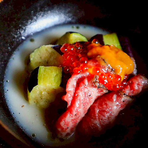 見た目にも美しく、盛り付けのセンスが光ります!カツオと梅のコラボが絶品です!新鮮なカツオは、しっとりとした舌触りと豊かな旨味が楽しめます。梅なめ茸の爽やかな酸味が絶妙に絡み合い、食欲をそそります。日本酒と合わせれば、さらに深い味わいが広がり心に残る逸品に!ぜひ一度味わってみてください。