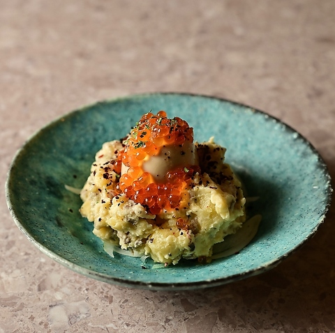 秋田県名物のいぶりがっこを居酒屋定番のポテトサラダと一緒に♪贅沢にイクラを添えて、お味はもちろん食感もお楽しみいただけます!