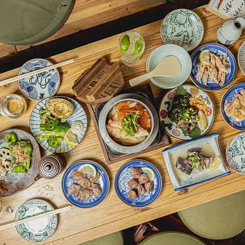 温かみのある木目を基調とした店内は、まるで隠れ家のような居心地の良い空間です♪足元を伸ばして寛げるお座敷席もご用意しており、日常の喧騒を忘れさせてくれます。大切な方とのお食事や、気の置けない仲間との語らいの場として、心ゆくまでお寛ぎください。