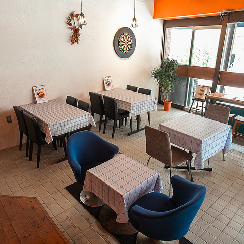 広々とした店内となっており4名掛けのテーブルが2席、2名掛けのテーブルが3席ご用意しています。友達との会話が楽しめるような落ち着いて雰囲気の当店で、おすすめのハンバーガーとドリンクと一緒にゆったりとお過ごしください♪