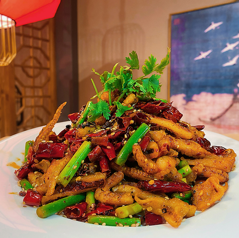 唐辛子は食べず、香りと旨みを纏った鶏肉を味わう料理になります!唐辛子と花椒の香りをお愉しみください。