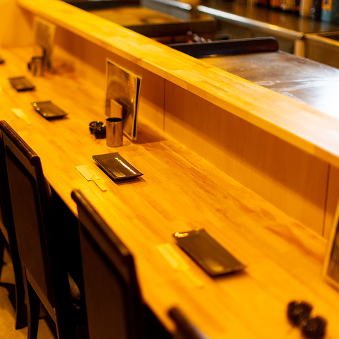 ≪オープンカウンター≫ オープンカウンターから目の前で繰り広げられる鉄板料理の調理シーンはシェフが手際よく食材を焼き上げる様子を間近で楽しめ、香ばしい香りと焼き上げる音が食欲をそそります。お客様との距離感が近く、会話を交えながら料理が出来上がる過程を共有できるのも魅力の一つ!