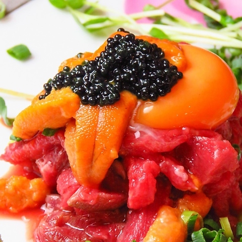 厳選!炙り黒毛和牛と濃厚生雲丹とキャビアの組合せは絶妙。口に入れた途端に広がる旨みをお楽しみあれ♪当メニューを含む[飲放]付き宴会コースもご用意がございます!仕事帰りの宴会や同窓会などにぴったりで超おすすめ!!詳しくはコースページをご確認ください★★〔宴会/少人数飲み会/接待/完全個室/喫煙/飲み放題〕