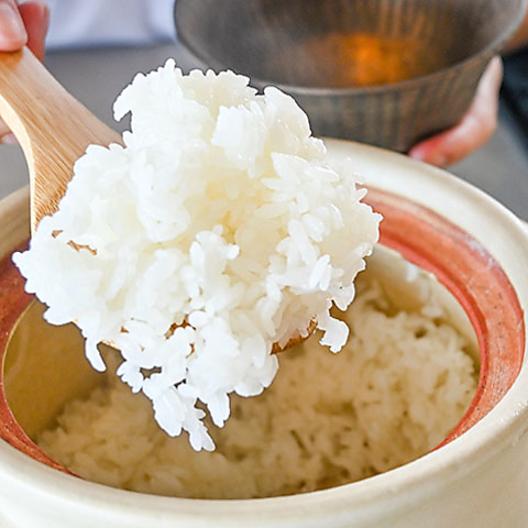 土鍋で運ばれてくる白ご飯は、お米マイスター厳選のブランド米の素材そのものを味わえるのも魅力です。土鍋で炊き上げた白ご飯は、日常で味わう白ご飯とはまた格別の味わいです。どちらの定食もご飯が残ったら、店主がおにぎりを握ってくれるサービスも。持ち帰っても土鍋で炊き上げたご飯を味わえます。