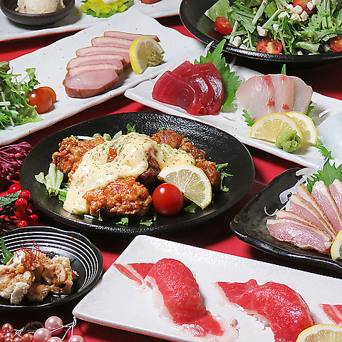 当店注目メニューの焼き鳥や肉寿司・すき焼きだけでなくえいひれ炙りや、地鶏たたきなど贅沢なラインナップ♪更に黒毛和牛までご用意!!大満足の内容となっております♪