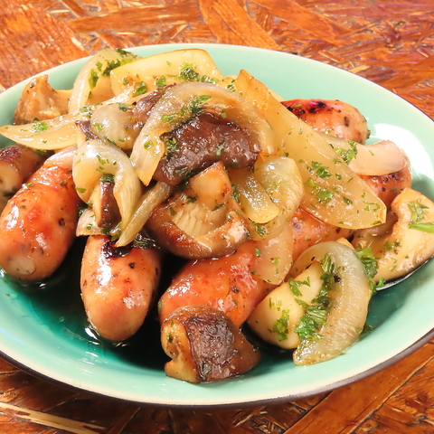 一口食べれば肉の旨味を存分に味わえる♪【杜仲茶ポークのソーセージと舞茸のボルドレーズ風】