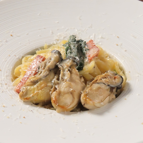 当店に来たらぜひ頼んで頂きたい逸品です。濃厚なクリームソースに、牡蠣の旨味とベーコンの香ばしさが溶け合い、ほうれん草のほどよい苦味がアクセント。プリッとした牡蠣とクリーミーなソースがパスタに絡み、口いっぱいに贅沢な味わいが広がる一皿です。