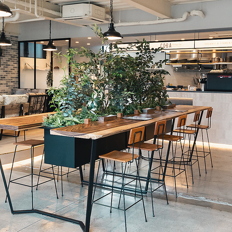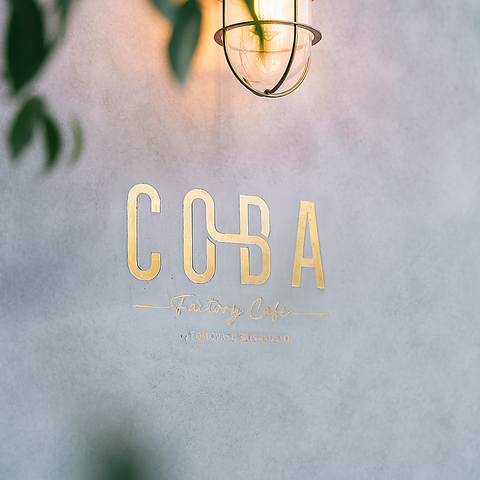 店名のCO-BA(コーバ) には2つの意味があります。1つは「交わる場」さまざまな人々の思いや交流を繋ぐ場という意味2つ目はお店の隣の(工場)。店内の内装、テーブルに至るまで、隣の工場で作成したものを使用!