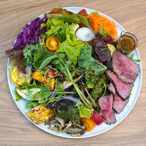 体が喜ぶをコンセプトにしたColorsサラダプレートは、地元八尾産を中心に全国から厳選した新鮮な無農薬・減農薬・有機野菜を使用。自家製の無添加ドレッシングで、安心かつおいしく味わえます。メインには、塩麹で漬け込んだ国産鶏むね肉のコンフィや、黒毛A5ランクのローストビーフ、旬の鮮魚のカルパッチョが選べます!