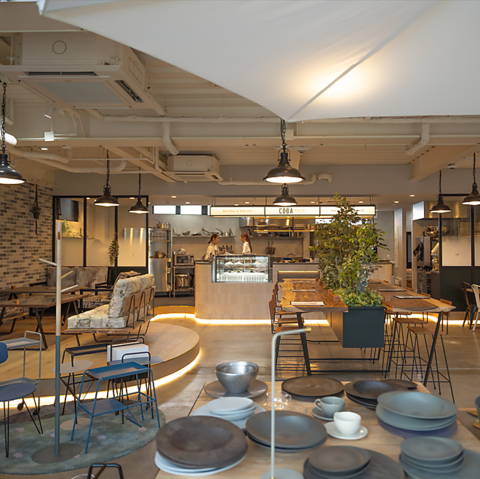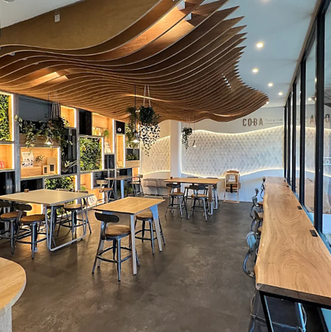店名のCO-BA(コーバ) には2つの意味があります。1つは「交わる場」さまざまな人々の思いや交流を繋ぐ場という意味2つ目はお店の隣の(工場)。店内の内装、テーブルに至るまで、隣の工場で作成したものを使用!