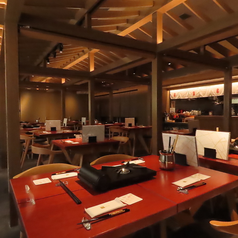 木の温かみとゴージャスな雰囲気を醸し出す赤いテーブル席のコントラストが、素敵な空間を演出しています。ぜひ、店内の美しい様子を楽しみながら、お食事をご堪能ください。落ち着いた雰囲気の中で、心地よいひとときをお過ごしいただけます。特別な時間を、ぜひ当店でお楽しみください。