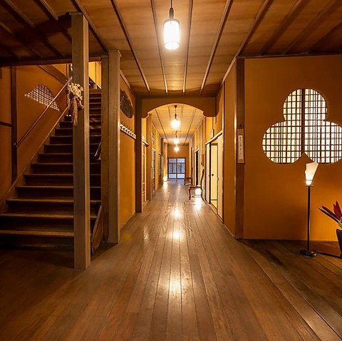 “天空への階段”が織りなす静謐なエントランスは、訪れる人々を優しく迎えます。壁に施された模様豊かな下地窓が、空間に深みを与え、行灯から漏れる柔らかな灯りが温もりを演出。静けさの中に広がる優雅な雰囲気が、特別なひとときを予感させます♪歴史の息吹とともに、特別な瞬間を感じることができる場所です。