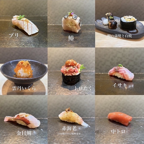 アテ約10品、寿司約9貫に加え、2時間30分飲み放題をお愉しみいただけるコースです。メニュー内容は仕入れ状況によって変動いたしますので、苦手なものがある場合は事前にお声掛けください。