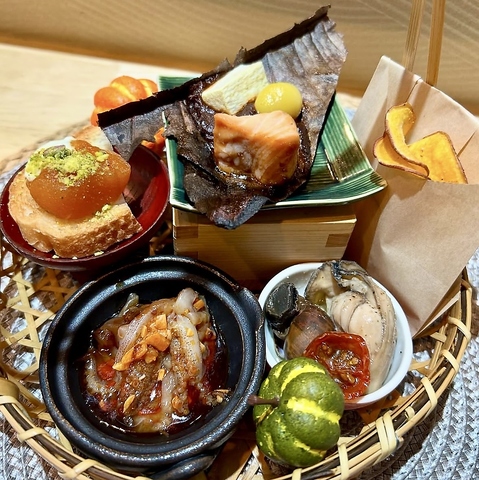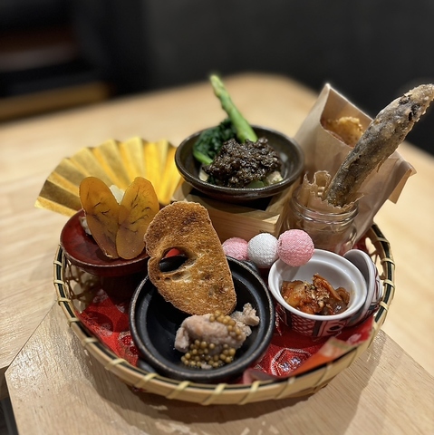自家製のカラスミに自家製の塩辛、その季節に合わせたおつまみを少しずつ。ビールやハイボールにも合うように意識しております。毎日少しずつ内容も盛り付けも変化しますのでいつ来て頂いてもお楽しみ頂けます。