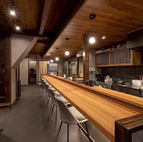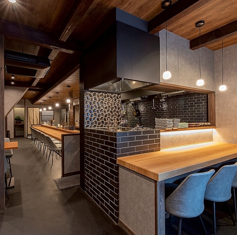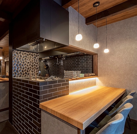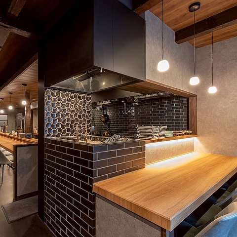 【オープンキッチン】に面したカウンター席は8名様までOK。シックなデザインの内装と開放的なムードの中、当店自慢の和酒と絶品料理をお楽しみいただけます。お仲間との語らいに、お一人様やデートでのご利用にも、どうぞお気軽にお立ち寄りください。