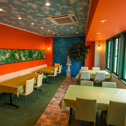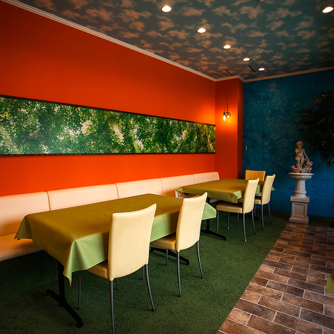 フランスのマルセイユで働いていたお店の太陽と海、緑の見える庭をイメージしたガーデンレストランです。