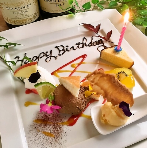 結婚記念日やバースデーのお客様にはご予約時にお申し出いただければ目メッセージプレートをプレゼント致します。また、七五三やご慶事、法事、合格祝い、退院祝いや歓送迎会など、一緒に食事される方に伝えたいメッセージなどありましたら何なりとお申し出下さい。