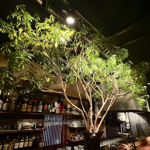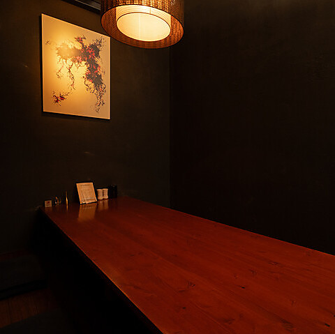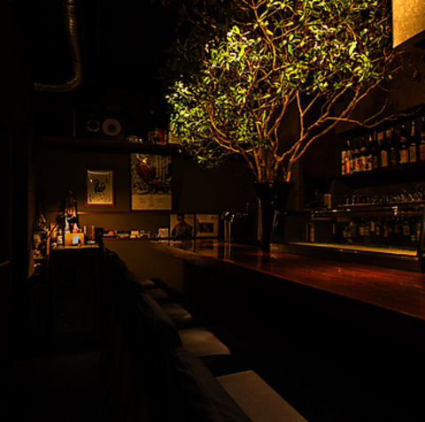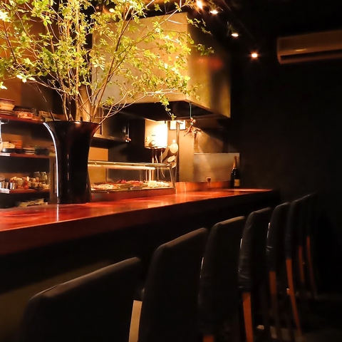 雰囲気のある暗めの照明と木の温もりがあるカウンター、そして緑の植物が心を落ち着ける空間を提供いたします。周囲を気にせずご友人や大切な方との会話を楽しめる落ち着いた雰囲気です。
