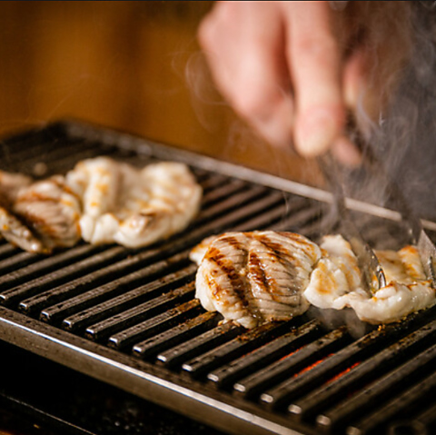 当店自慢の焼きふぐ。淡白な身をジューシーに仕上げるため油でコーティング。素材の味わいを閉じ込めて焼き上げます。異なる部位・食感を楽しめますので、お客様から非常に人気のある逸品です。