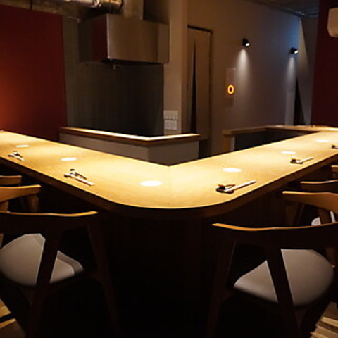 【温かみのあるモダンな空間】特等席のカウンターは、炭火を使った焼き物料理の調理風景を楽しめるライブ感が愉しめるのも魅力です。