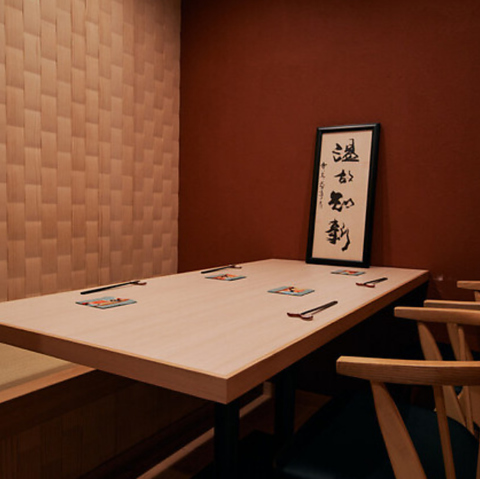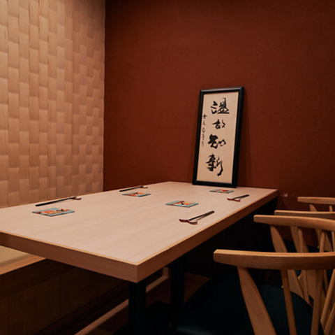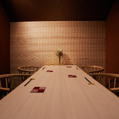 【ゆったりと寛げる完全個室】シンプルで洗練されたデザインが和やかなひと時を演出。テーブルは広々としており、ゆったりと寛ぎながらお食事をお愉しみいただけます。接待や会食、ご家族のお祝い事など特別な時間を過ごすのにも最適な空間です。