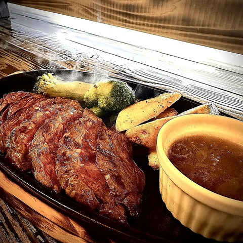 当店自慢のステーキは、サガリ(横隔膜)150gをご用意しております。ジューシーで柔らかなサガリは、肉の旨味がしっかりと感じられ、一口食べるごとに満足感が広がります。適度な脂の甘みと赤身が合わさり、ドリンクとの相性も抜群!贅沢なひとときをお約束いたします。皆様のご来店を心よりお待ちしております!