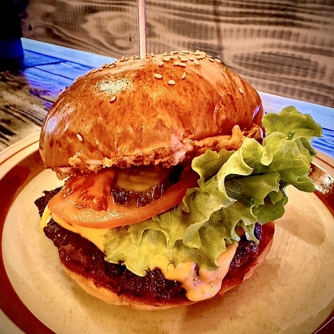 レタス・トマト・ピクルスの100%ビーフハンバーガーあり!おいしいバーガーで楽しい時間をお過ごし下さい♪