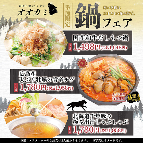 ★国産和牛だしもつ鍋1648円★広島産大ぶり牡蠣の旨辛チゲ1958円★北海道千年豚の極み出汁しゃぶしゃぶ1958円●追加メニュー■もつ(150g)845円■野菜(1人前)603円■〆のうどん(1玉)427円■〆のラーメン(100g)427円■〆の雑炊(150g)427円■牡蠣(4ヶ)878円■しゃぶしゃぶ肉(110g)878円※鍋の価格は1人前です。注文は2人前から。