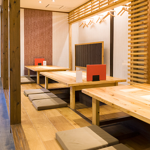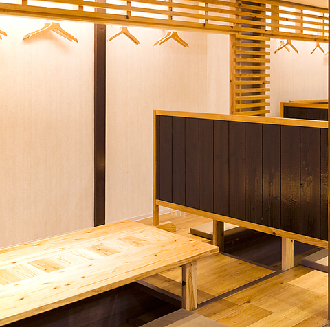 温かみのある木材をふんだんに使用し、自然のぬくもりが感じられる空間です。木目の柔らかな質感が視覚的にも心地よく、落ち着いた和の雰囲気。ゆったりと足を伸ばせる掘りごたつ式で、心からくつろげる場所として、訪れるすべてのお客様に安らぎの時間を提供します。是非お気軽にお越しください。