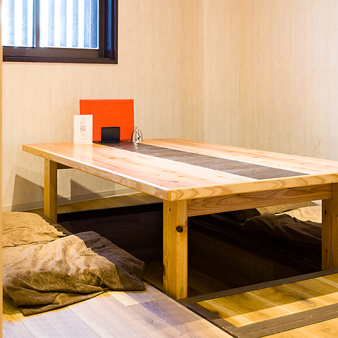 掘りごたつ席をご用意。あたたかみある木の空間に包まれながら、仲間と語らうひとときにぴったりです。