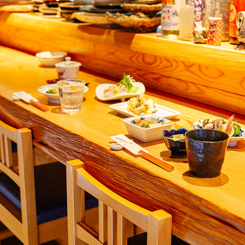 仕事終わりのしっぽり飲みに嬉しいカウンター席もご用意しております。お一人様はもちろん、ご友人同士や同僚とのお食事にもおすすめのお席です◎焼酎・日本酒を豊富にご用意しておりますので、お好みのお酒を見つけてみてはいかがでしょうか?