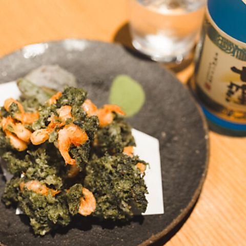 旬の素材をカラッと揚げた天ぷら盛り合わせ。海老や野菜、かき揚げなど、彩り豊かに盛りつけております。抹茶塩でさっぱりとお楽しみください。種類豊富な日本酒との相性も抜群な一品です。