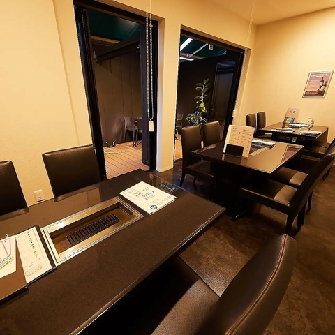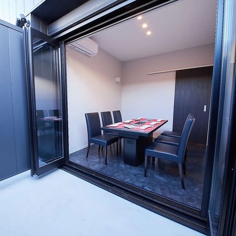 【気持ちいい8名様用テラス席♪】女子会や友人同士の集まりなどにぴったりの8名様用テラス席は、モダンでオシャレな雰囲気。レザーのイスでさらに高級感アップ♪柔らかに照らす照明もグッド♪