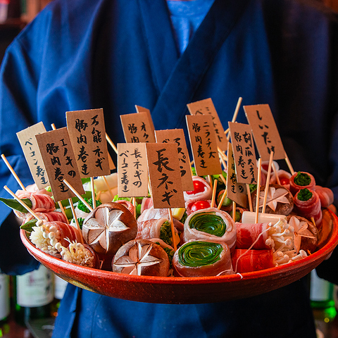 当店自慢の博多名物・野菜巻きは、新鮮な野菜を豚肉で包み、香ばしく備長炭で焼き上げた一品。ジューシーな旨みとシャキシャキ食感を、心ゆくまでお楽しみください!そんな野菜巻きが楽しめる宴会コースは5,000円~ご用意!ゆったり3時間飲み放題付きで八重洲での飲み会や女子会、合コンなど様々な宴会にご活用頂けます♪