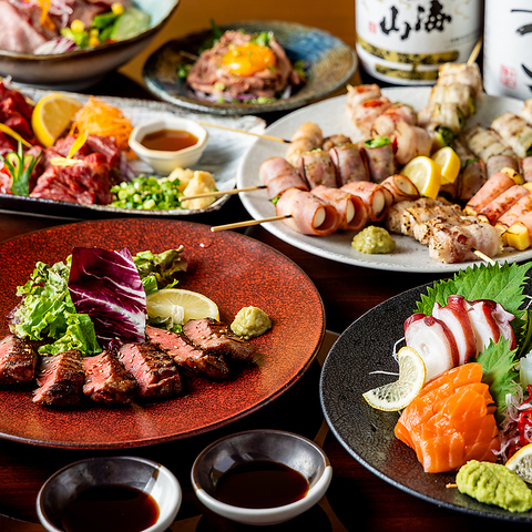 当店では、「仙台牛タン」「博多野菜巻き」「天然馬刺し」の三大名物を中心に、自慢の和食をご提供しております!厚切りでジューシーな仙台牛タン、新鮮野菜を豚肉で包んだヘルシーな博多野菜巻き、そして鮮度抜群の天然馬刺しは、いずれもお酒との相性抜群♪宴会コースは5,500円~でたっぷり3時間の飲み放題付き!
