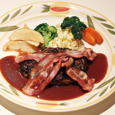 ちょっぴり大きめのハンバーグにベーコンを添えて。