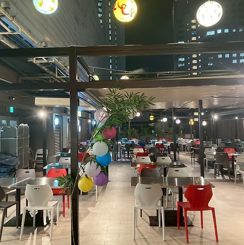 【駅直結の好立地】四つ橋線・西梅田駅から地下直結で、雨の日も濡れずに来店OK。大阪駅・北新地駅からも徒歩圏で集まりやすさ抜群。仕事帰りや友人・家族の集まりにも便利。入口では招き猫と群馬県の高崎だるまがお迎えします♪入った瞬間から屋台気分を楽しめます♪寒い日や雨の日でも快適な屋外ビアガーデン施設!