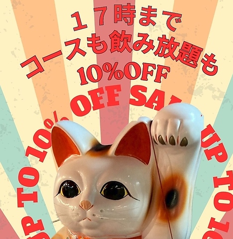 17時までの入店でコースと飲み放題が10%OFF!明るい屋上で楽しむ、お得な昼宴会を団体様も是非どうぞ。