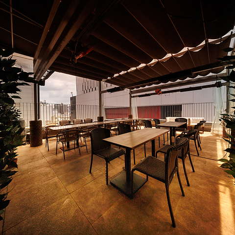 開放感たっぷりのテラス席はまるで街中のオアシス空間!夜にはライトアップでムード満点に!天候に左右されにくい屋根付き使用で、安心してくつろげます!いつもと違うひとときをお楽しみください!