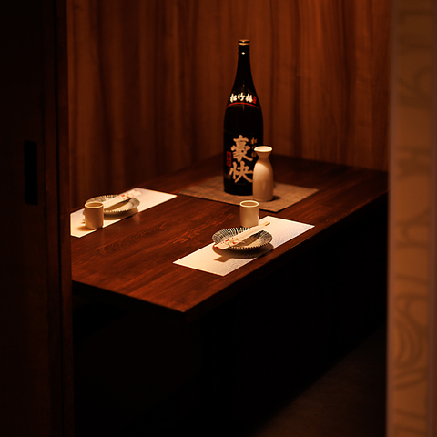 木目の壁に囲まれこじんまりとした半個室!二人でしっぽり楽しめるコンパクトな空間は、デートやサシ飲みにピッタリ!のれんがさりげなくプライベート感を演出し、ゆったりとした時間を楽しめます!