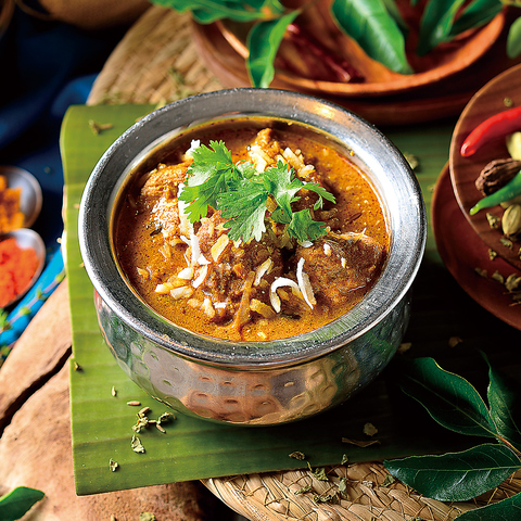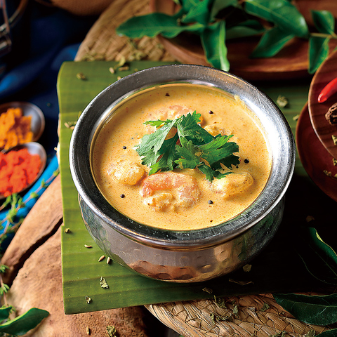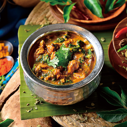 当店が一押しするカリーは南インドカリー。北インドのカレーと比べると、油脂類が少なく軽やかでサラッとしていて酸味が特徴的です。ココナッツを多用するのも南インド的といえます。日本と同じ米食文化の南インドでは定番のチキンに加え、マトンや魚介類など豊富な具材とお米を合わせて食べる文化があります。