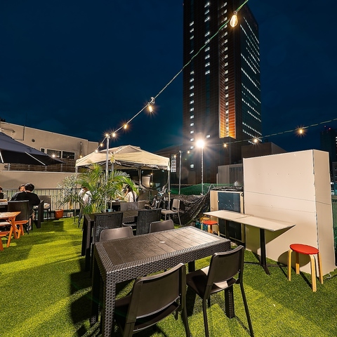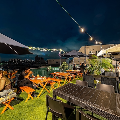 ビルの屋上に広がるルーフトップテラスは、緑あふれる空間と夜景が魅力。人工芝のフロアと木製テーブル、装飾ライトが温かみを演出し、まるで都市のオアシス。夜風に吹かれながらのビールや食事は格別です。おしゃれなパラソルや植物の装飾で、都会にいながら自然を感じられるくつろぎの時間を提供します。