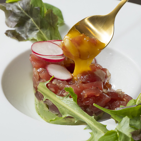 ◇鮮度抜群、国産牛タンと併設店でも使用している濃厚卵黄を使用した極上牛タンユッケ☆お客様が来店された際にファーストオーダーで御注文いただく事が多いので、乾杯のお供に是非ご賞味くださいませ♪