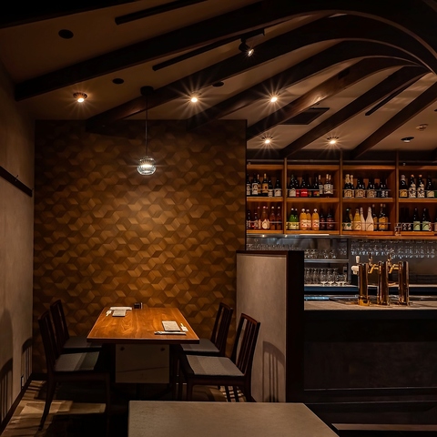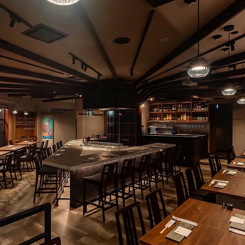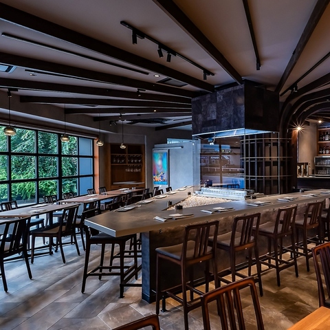 店内は、ギャラリー型照明がテーブルを美しく照らし、コンテンポラリーなBGMが控えめに流れる、洗練さと温かみを併せ持つ空間。中心には、料理人の所作を余すところなく観ることができる個性的なV字型のカウンター席。