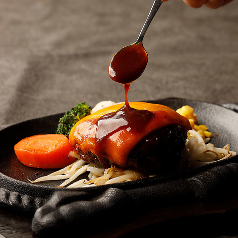 黒毛和牛100%で作ったハンバーグはこだわりです。粗挽き肉を使用することで肉肉しさを全面に引き出し、お肉の食感を楽しめる歯応えの後からガツンとくる肉の旨味が最高の瞬間に。粗挽き肉が含んだ潤沢な肉汁は噛む度に溺れるかのような体験をさせてくれます。日本が誇る高品質な黒毛和牛を使用した黒毛和牛100%ハンバーグをご賞味ください。