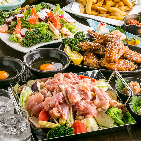 四季折々の味覚を楽しめる前菜から始まる、贅沢なコースです。とろーり温玉のシーザーサラダ、新鮮な魚介のカルパッチョ、特製のたれに漬け込んだ鶏の唐揚げなど、こだわりの料理をご用意。さらに、香ばしい鰆の京風西京焼きや、〆の焦がし醤油香る焼き飯まで、心ゆくまでご堪能いただけます。各種宴会にも最適な、ボリューム満点のコースです。