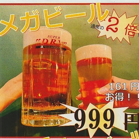 お得にたくさん飲みたい方必見!通常の2倍量のメガビール、メガサワーメガボールがございます!