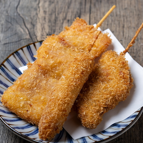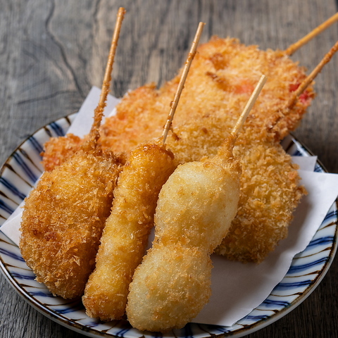 ビールやハイボールにぴったりの串カツメニューを多数ご用意していますが、どれにしようか悩んだときにオススメなのが「串カツ5種盛り合わせ」!まずはこれで一杯楽しんで、ゆっくりお好みを選ぶのもいいかも◎3種盛り(税込385円)もありますので、合わせてご利用ください!
