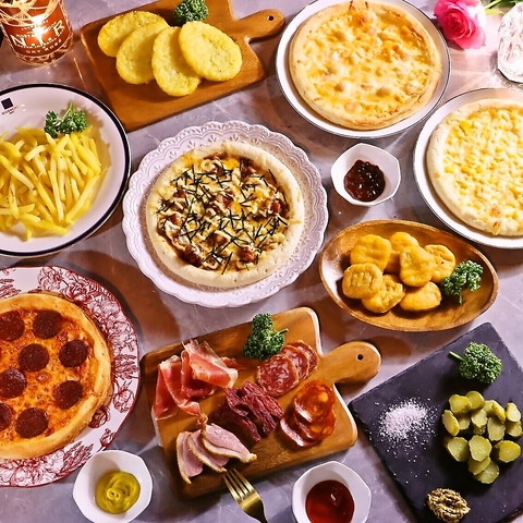 THE Rest Gardenのアラカルトは、味わい深い料理が揃っています!ペパロニピザやシーフードピザは、外はカリッと中はふんわり。テリマヨやコーンマヨピザの濃厚な味わい、サクサクのチキンナゲットやクリスピーなフライドポテトも楽しめます。ハムの盛り合わせやピクルスも加わり、心ゆくまでお楽しみいただけること間違いなし!お酒との相性◎